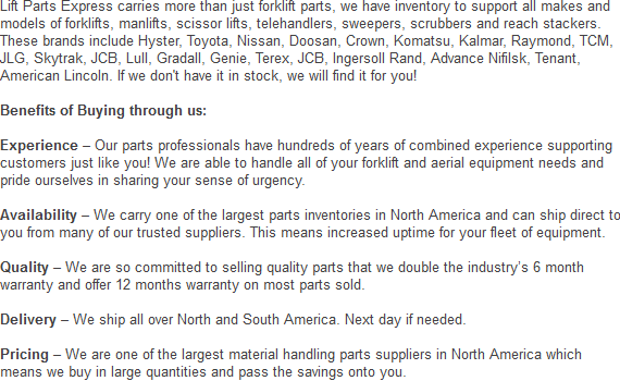 All our lift truck parts are obtainable at the best prices. Call today to get an estimate on one of the parts or attachments we offer. We can be reached at: